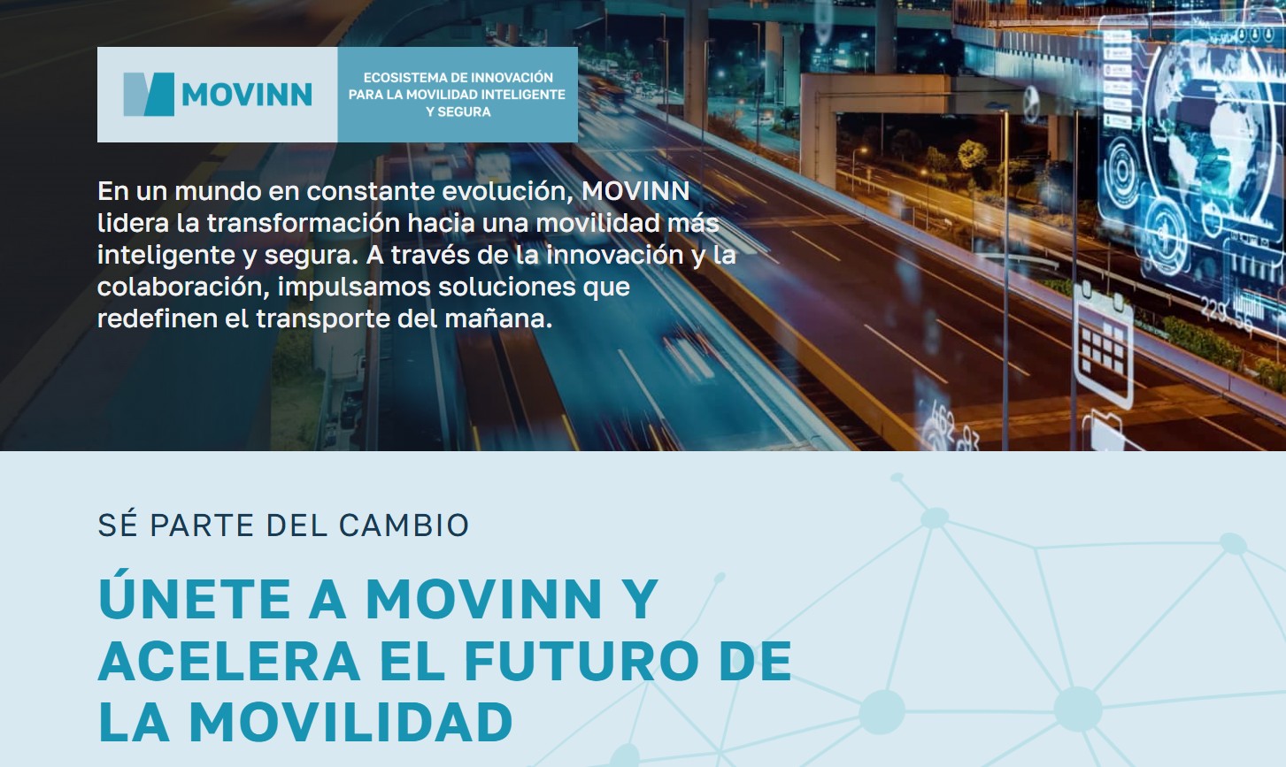 Ya puedes acceder a la nueva página web del proyecto MOVINN que tiene como objetivo principal contribuir a la transformación de la movilidad en España. MOVINN se enfoca en la movilidad inteligente y segura para impulsar la movilidad de futuro, y para ello, busca desarrollar una estrategia a largo plazo que fomente la colaboración entre los actores del sector, avanzando en el despliegue de la movilidad conectada, cooperativa y automatizada (CCAM).