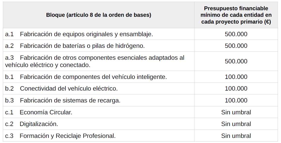 3. Se establece como presupuesto financiable mínimo del proyecto tractor, 10.000.000 de euros. El presupuesto mínimo de conceptos financiables para cada proyecto primario en función de los bloques se refleja en la siguiente tabla: