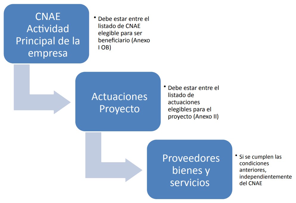 - Pueden ser beneficiarios exclusivamente las entidades con CNAE "principal" recogido en el Anexo I. El resto de agentes clave únicamente tendrán cabida como subcontratistas.