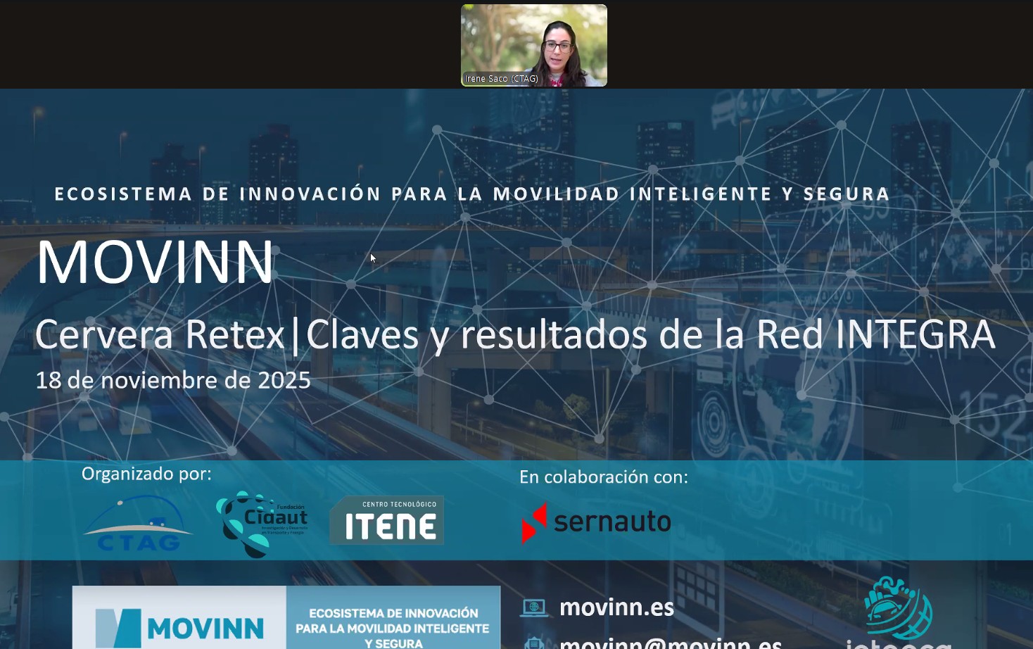 El pasado 18 de noviembre celebramos el webinar formativo sobre los resultados de la Red INTEGRA, coordinada por CTAG, con el respaldo de ITENE y CIDAUT, y en la que colaboramos desde SERNAUTO en el marco del proyecto Ecosistema de Innovación MOVINN.