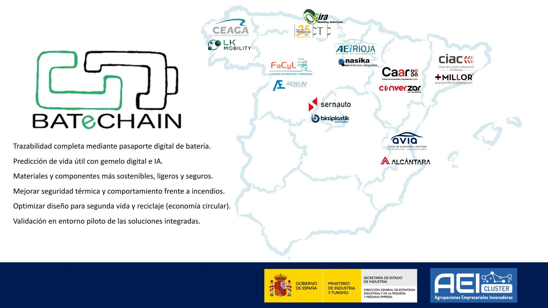 El proyecto BATeCHAIN, está financiado por el programa de apoyo a las Agrupaciones Empresariales Innovadoras (AEI) del Ministerio de Industria, dentro de la línea de proyectos de investigación, desarrollo e innovación en cooperación para dar respuesta a retos estratégicos, se desarrollará hasta agosto de 2026.